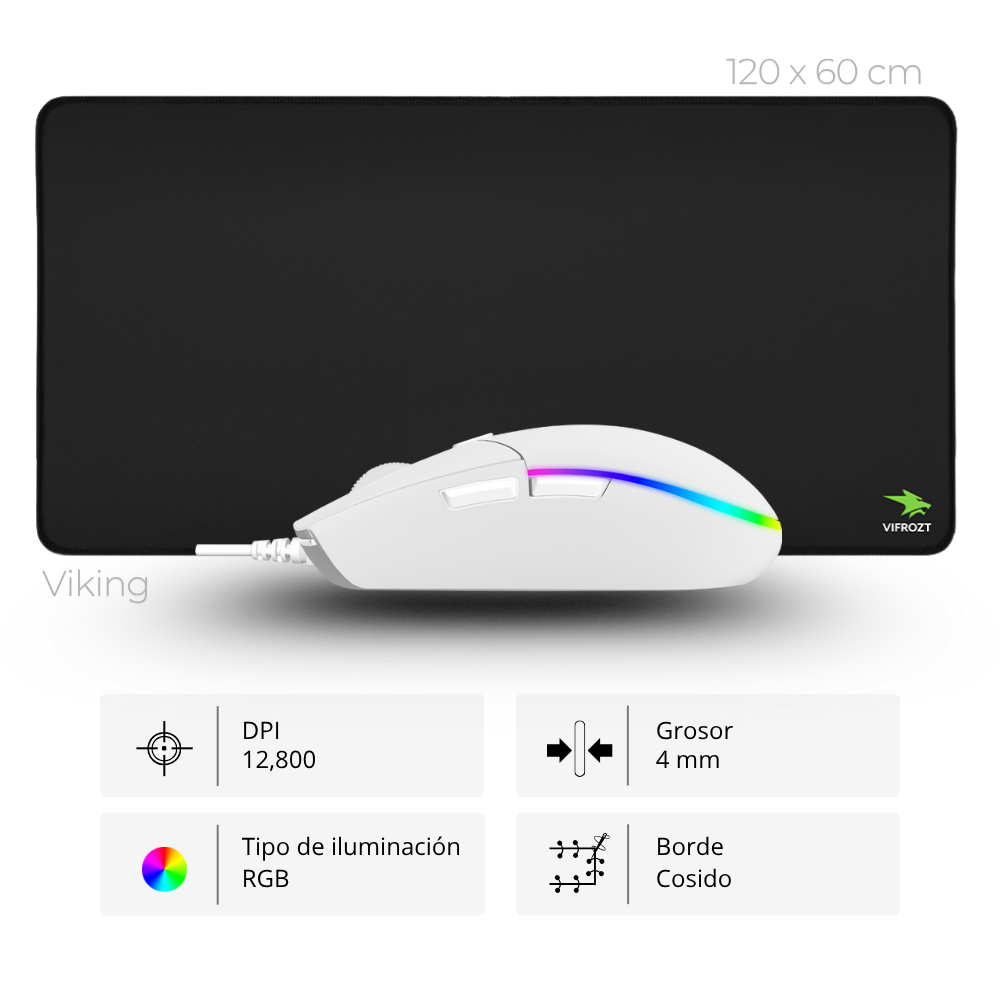 Combo Vifrozt Mouse Gamer + Mousepad Valhala 3XL 120×60 cm Blanco