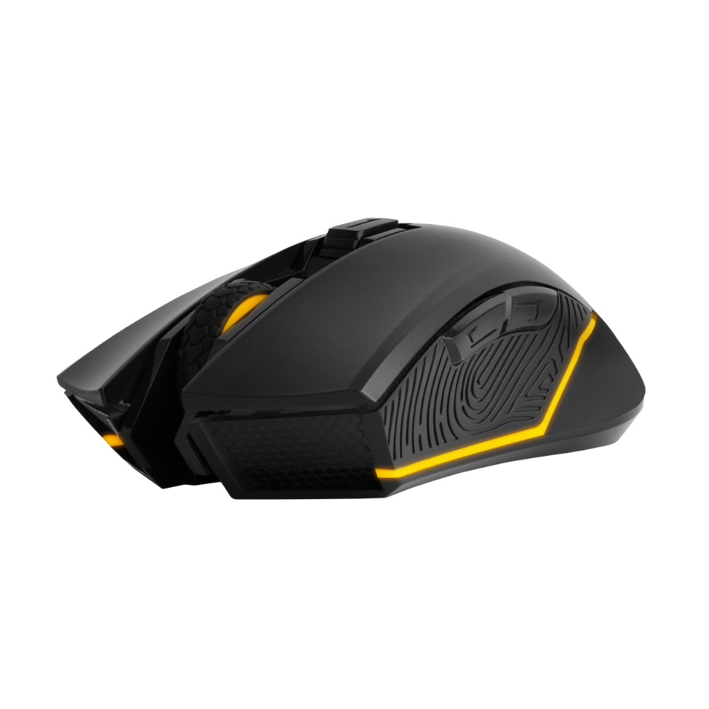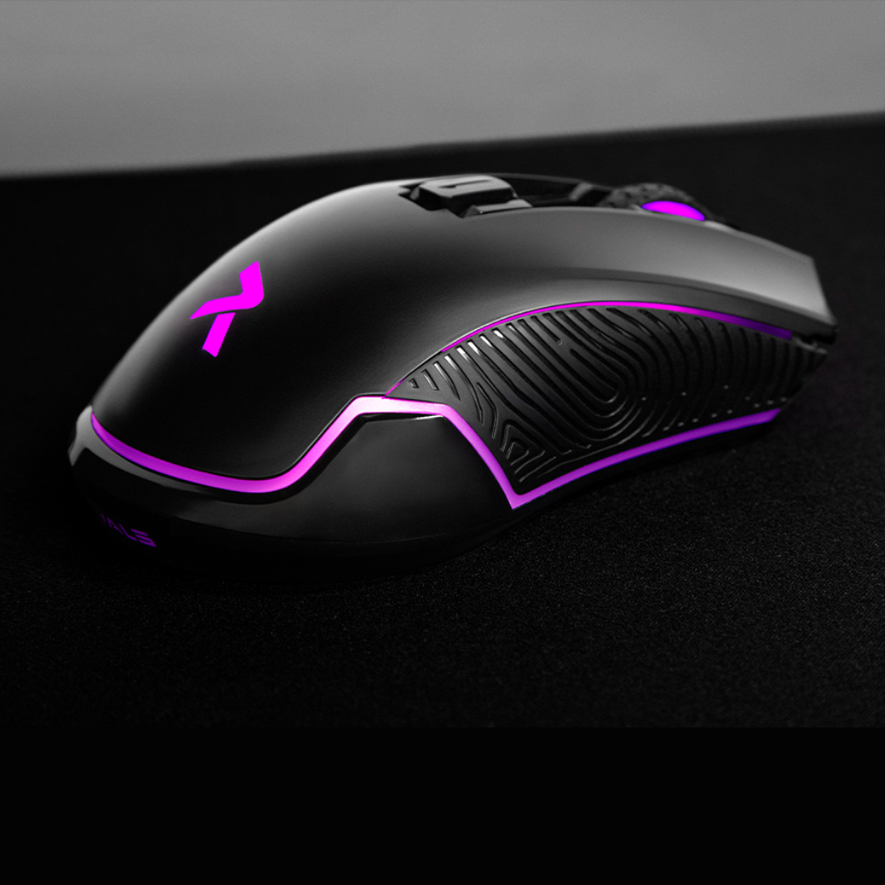 Mouse Inalámbrico RGB programable de 6 botones y 4,800 DPI, con software personalizable y acabado mate, acompañado de un mousepad Aura Extended de 80×30 cm con superficie speed antideslizante, fácil de limpiar, optimizado para todo tipo de sensores.