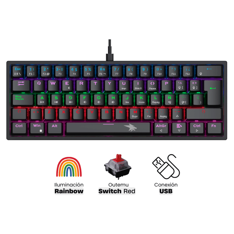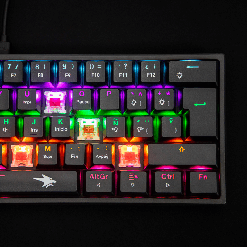 Combo gamer con teclado 100% mecánico formato TKL (80%) con RGB de 20 efectos, acompañado de un mouse RGB programable de 6 botones y 16,000 DPI, y un mousepad XL de tela con textura speed y base de goma antideslizante.