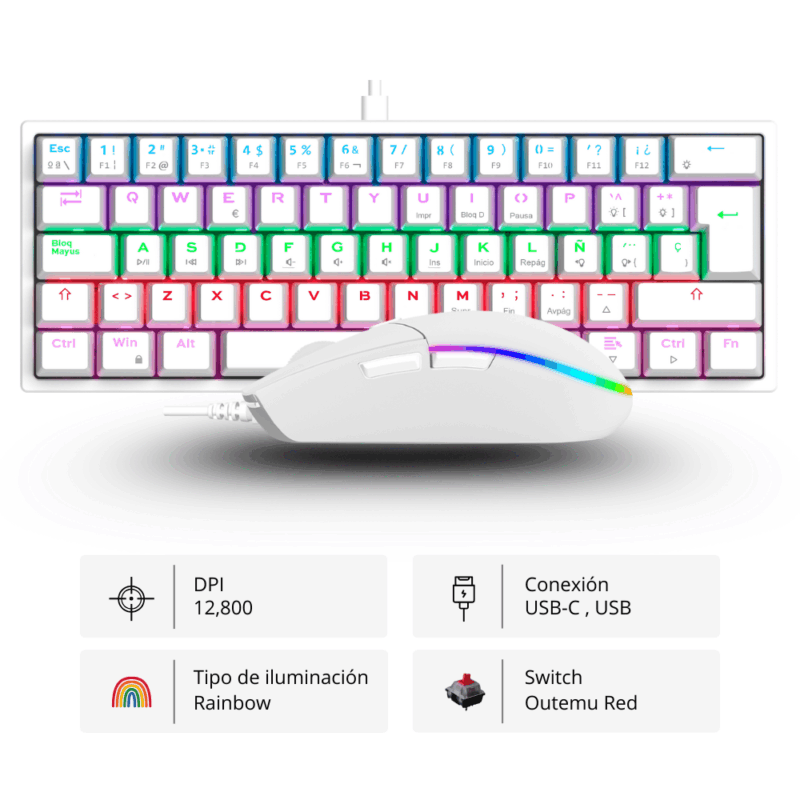 Combo gamer con teclado 100% mecánico formato TKL (80%) con RGB de 20 efectos, acompañado de un mouse RGB programable de 6 botones y 16,000 DPI, y un mousepad XL de tela con textura speed y base de goma antideslizante.
